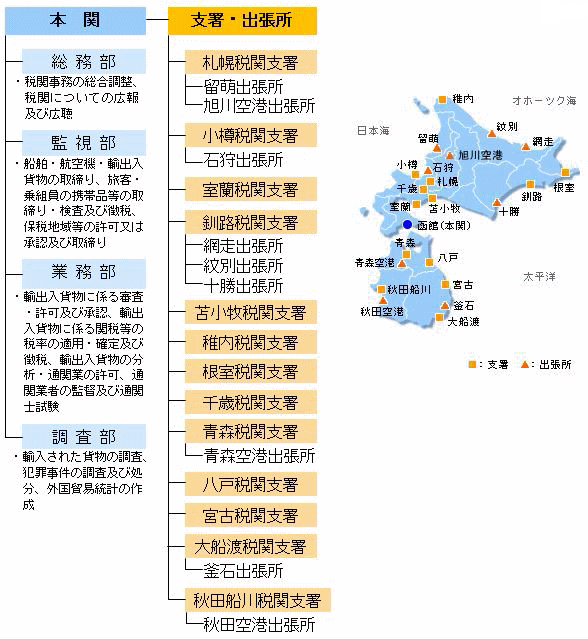 函館税関の本部(本関)には、内部組織として総務部、監視部、業務部、調査部があり、また、管内各地に支署(13)、出張所(9)が設けられています。