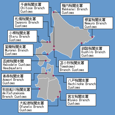 | 函館税関本関 | 040-8561 | 北海道函館市海岸町24-4(函館港湾合同庁舎) | 0138-40-4213 | 北海道、青森県、岩手県及び秋田県 | ||