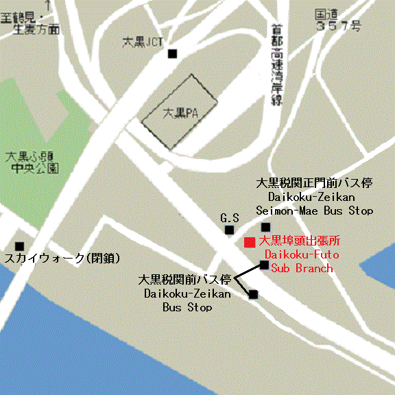 | 交通 | JR横浜駅東口バス乗場から市営バス109系統海釣り公園行 又は109系統スカイウォーク行で「大黒税関正門前」下車 JR鶴見駅から市営バス17系統流通センター経由鶴見駅前行 又は急行流通センター経由鶴見駅前行で「大黒税関前」下車 JR鶴見駅から市営バス17系統急行L8バース経由鶴見駅前行 又はL8バース・流通センター経由鶴見駅前行で「大黒税関正門前」下車 (便数が少ないので、事前に時刻表等でご確認ください) |