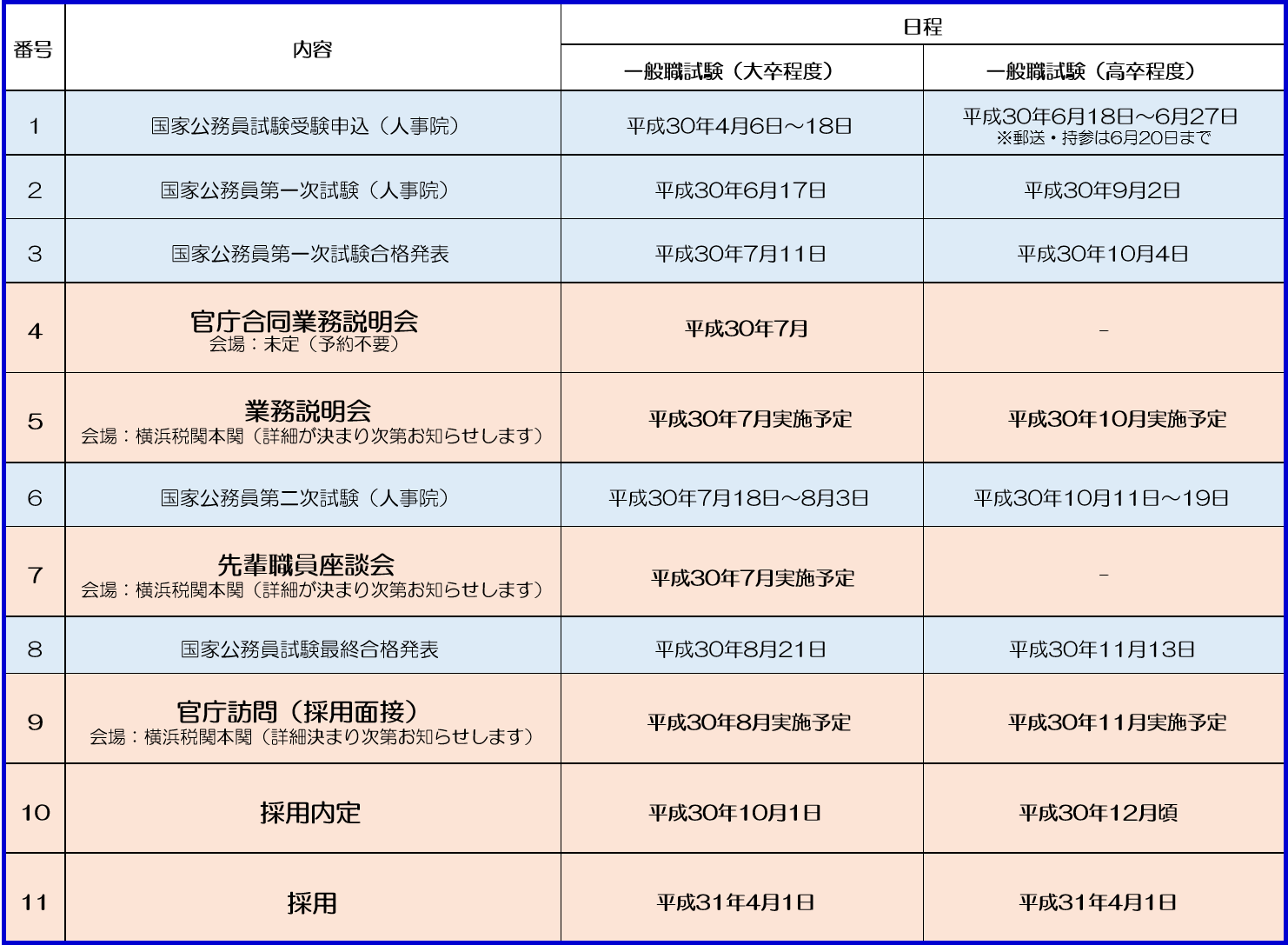 横浜税関におきましても、国家公務員一般職試験の日程にあわせて業務説明会、官庁訪問等を行っており、日程等の詳細を随時掲載しております。
