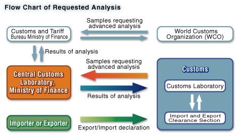 At present, nine Customs and a total of 200 Customs branch offices and subbranch offices have been established in Japan. The Analysis Department of each Customs analyzes imported items as requested. If the Analysis Department comes across an imported item that is too difficult or impossible to analyze, it requests the CCL to conduct the analysis. When the CCL receives an analysis request from a Customs, the CCL considers what will be the most appropriate analysis method for the item and then examines the item using highly sophisticated knowledge and high-performance analysis equipment. The chemist that has examined the goods compiles a report on the analysis result. Each Customs classifies the goods on the basis of the report.