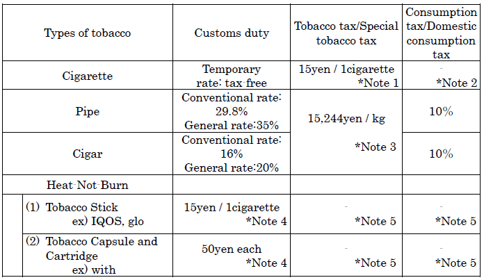 | *Note 5 | Heat-Not-Burn tobaccos subject to simplified tax rate are not subject to tobacco tax, special tobacco tax, consumption tax, or domestic consumption tax. |