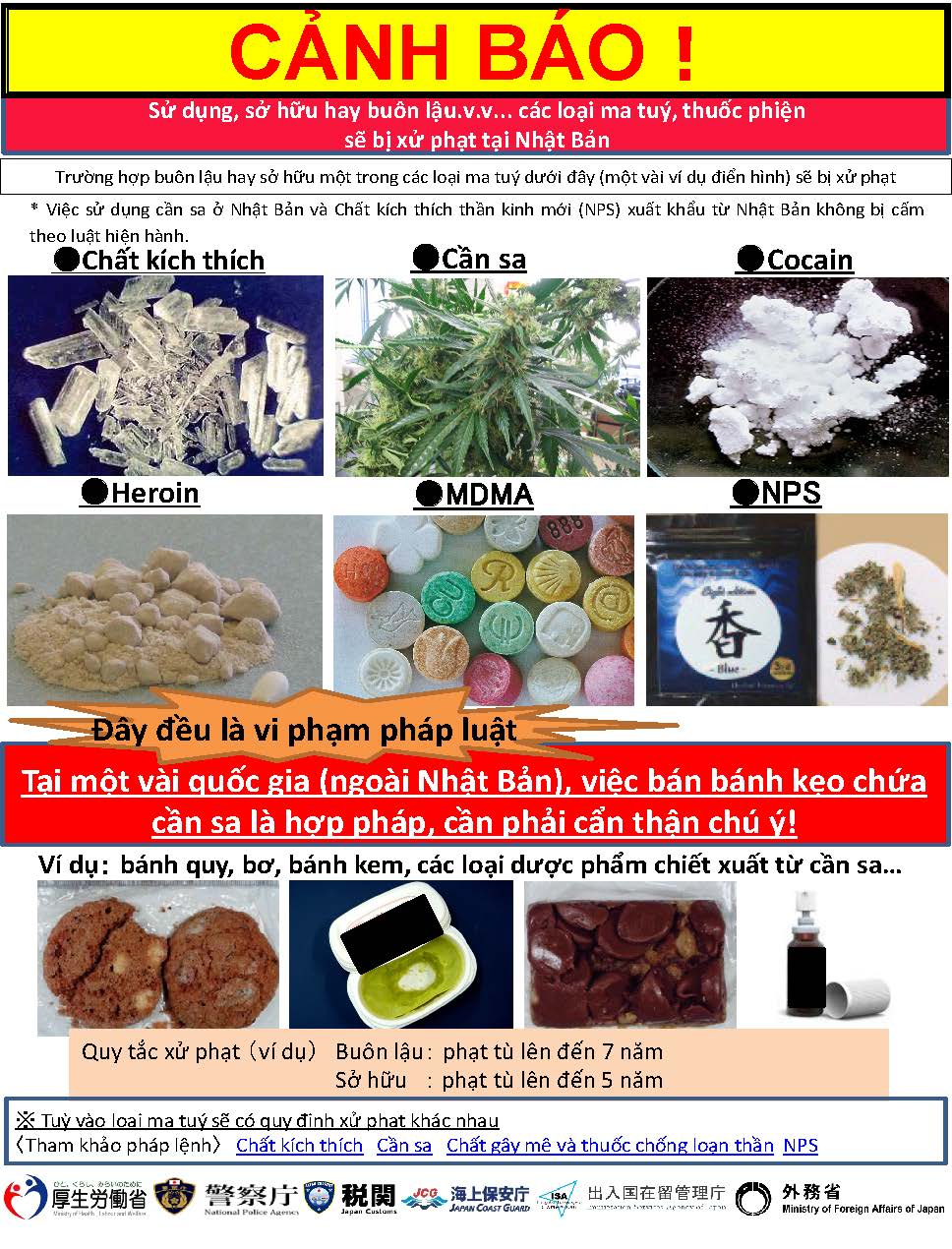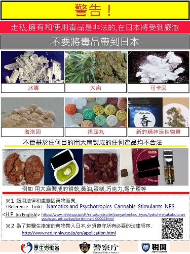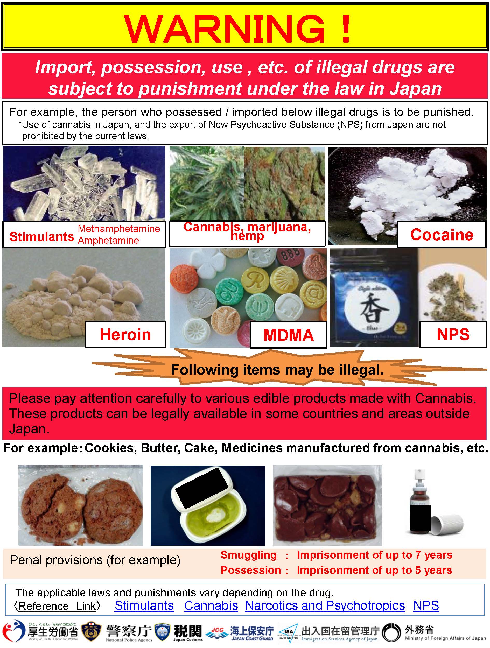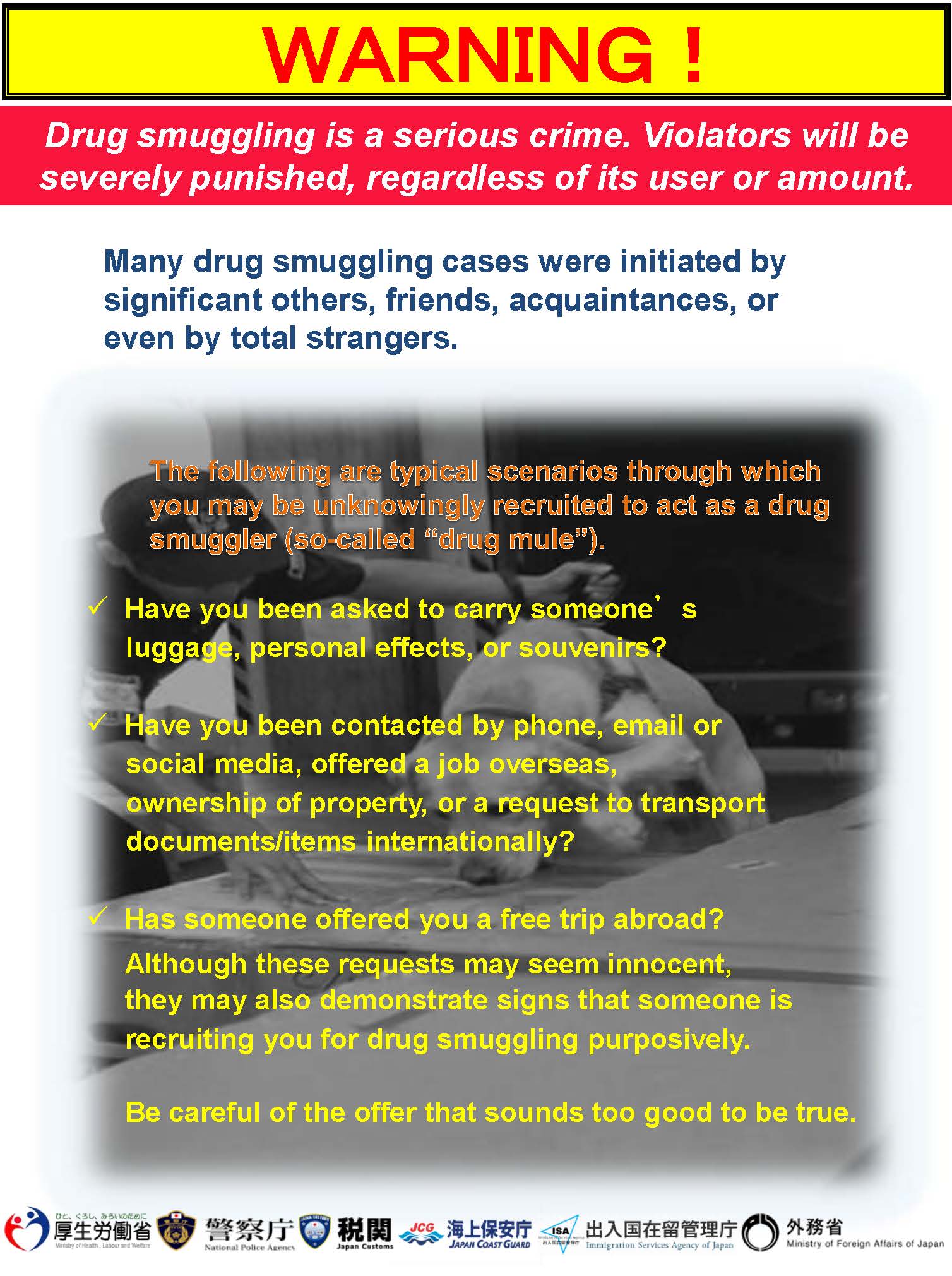 Drug smuggling is a serious crime. Violators will be severely punished, regardless of who will use the drug as well as its amount. Don't even think about bringing drugs to Japan.