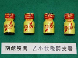 犯則嫌疑者は、輸入してはならない貨物である、指定薬物の「亜硫酸イソブチル」を含有する液体「RUSH」を、インターネットを利用して中国から2回にわたり国際郵便により密輸入しようとしたものである。
