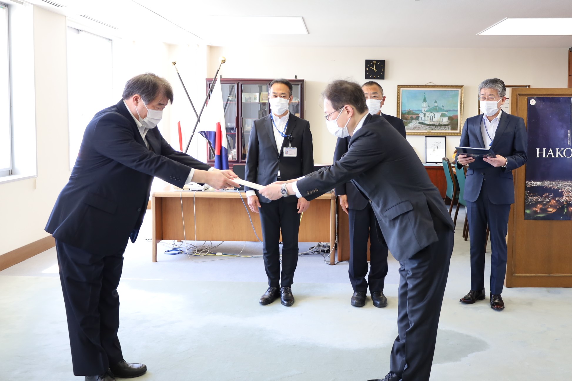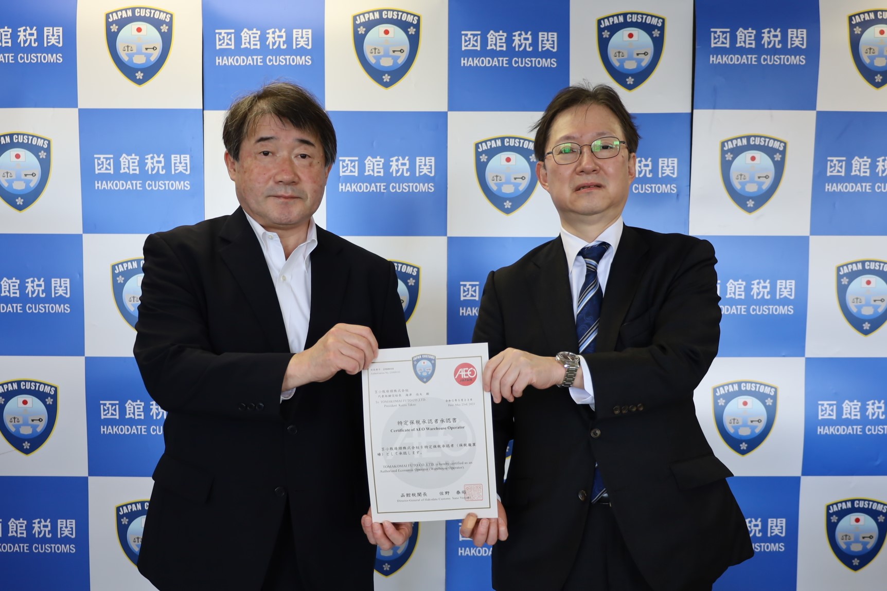 函館税関は、令和5年5月23日(火)苫小牧埠頭株式会社(北海道苫小牧市)を AEO( Authorized Economic Operator: 認定事業者)制度に基づく特定保税承認者として承認し、函館税関本関において承認書を交付した。