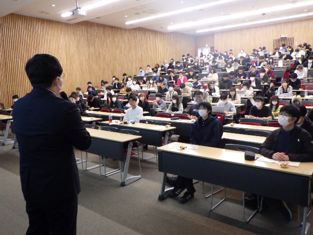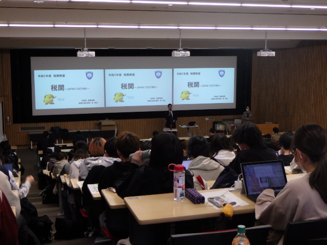 函館税関は、小樽商科大学において、「国際経済学」の講演を実施した。大学生約 200 名に対して、国際経済における税関の役割や機能、コロナ禍前後を比較した貿易動向等を説明した。