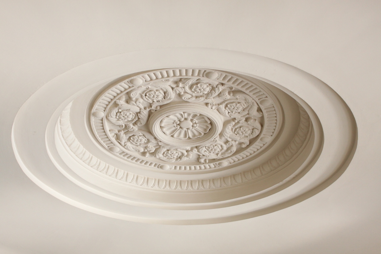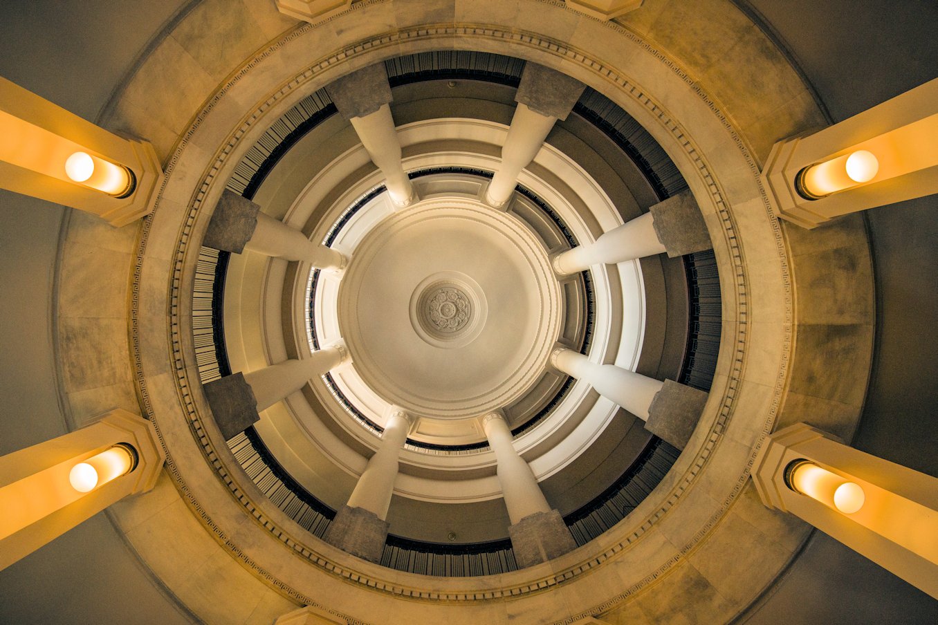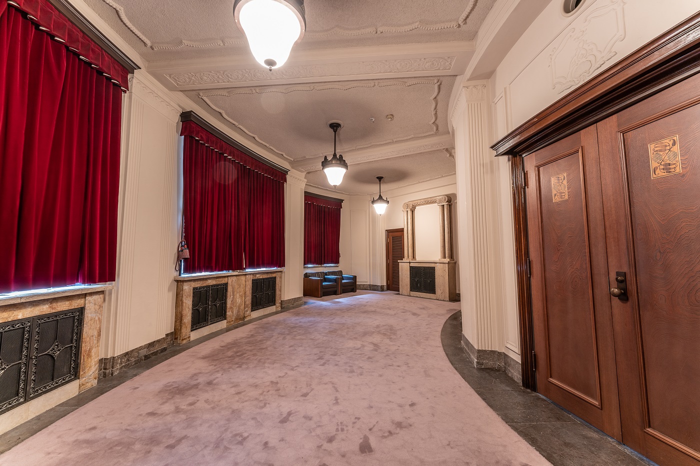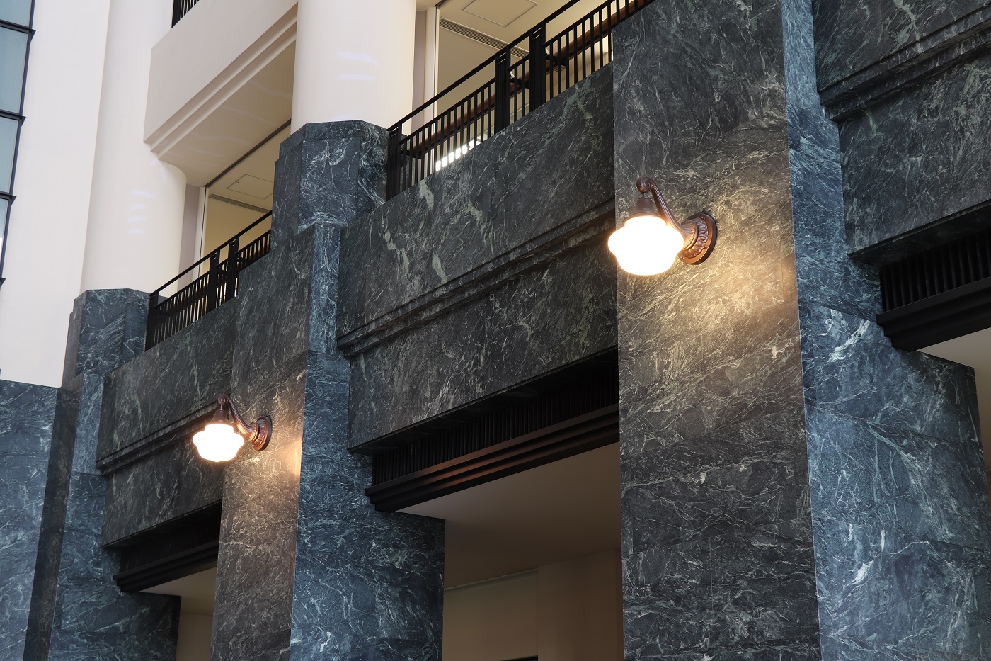 | 新館アトリウム正面最上部の石膏レリーフは、旧税関長室の壁面装飾を拡大したものです。 | 新館アトリウムの照明は、2代目庁舎建造当初の照明デザインを復刻したものです。 |