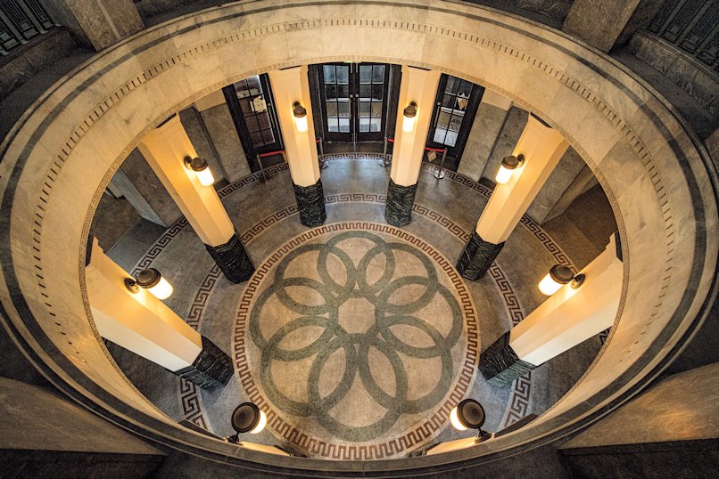 | 昭和2年当時は正門でした。現在は東門として多くの方をお迎えしています。 | 東門を入り、3階吹き抜けを見上げると美しいレリーフが目に入ります。 | 昭和2年から神戸税関を訪れた多くの方を見守ってきたレリーフ。 |