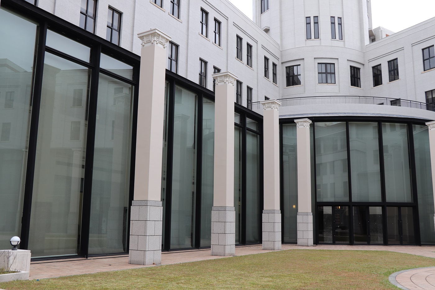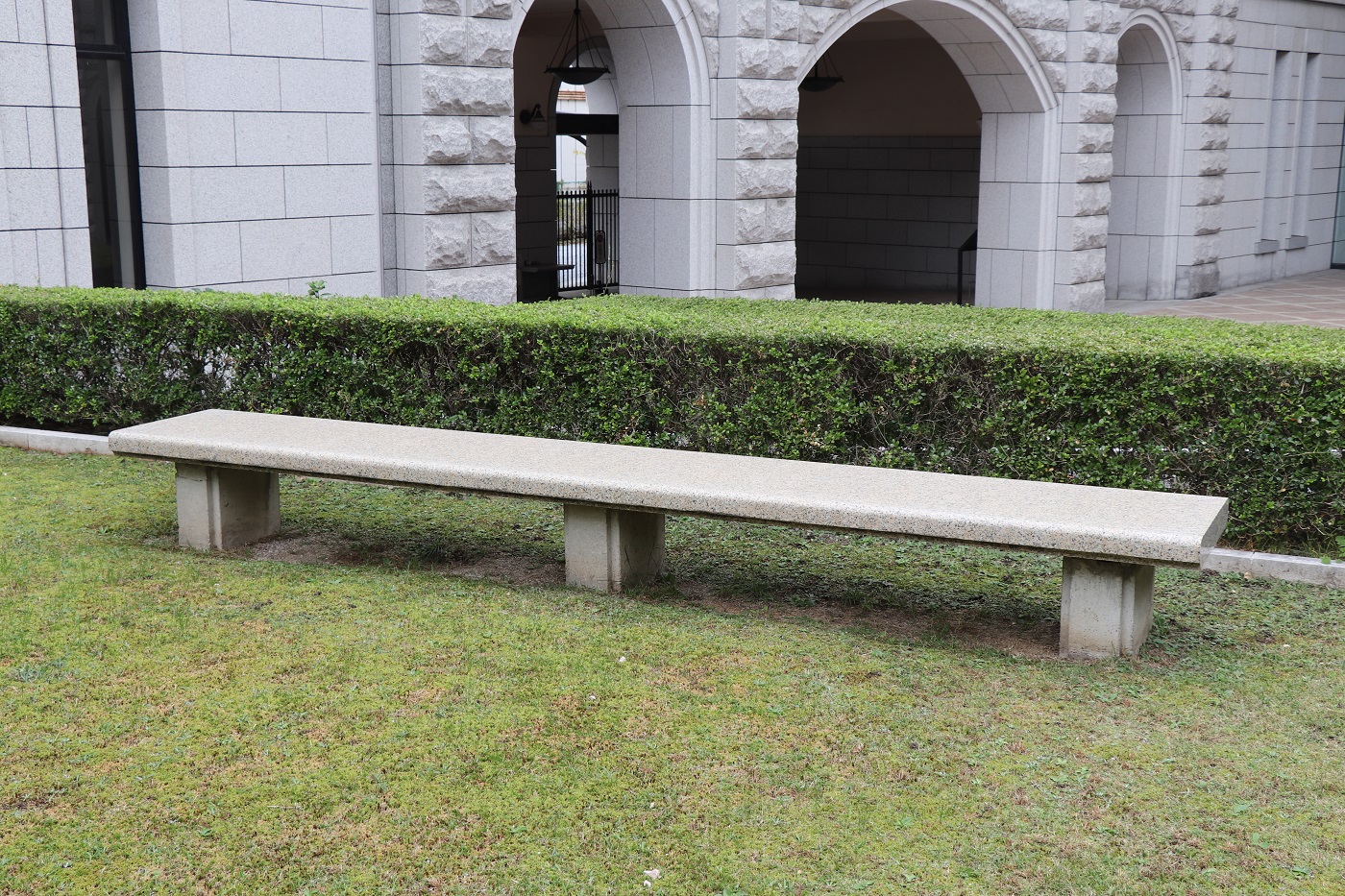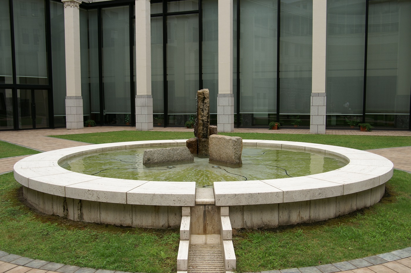 | 中庭に独立して立つ柱列は、旧館の二層吹き抜けの屋根を支えていたものです。 | 中庭の噴水には、旧館外構の敷石を再利用しています。 | 中庭のベンチには、旧館1階事務室にあったカウンターの花崗岩でできた天板を再利用しています。 |