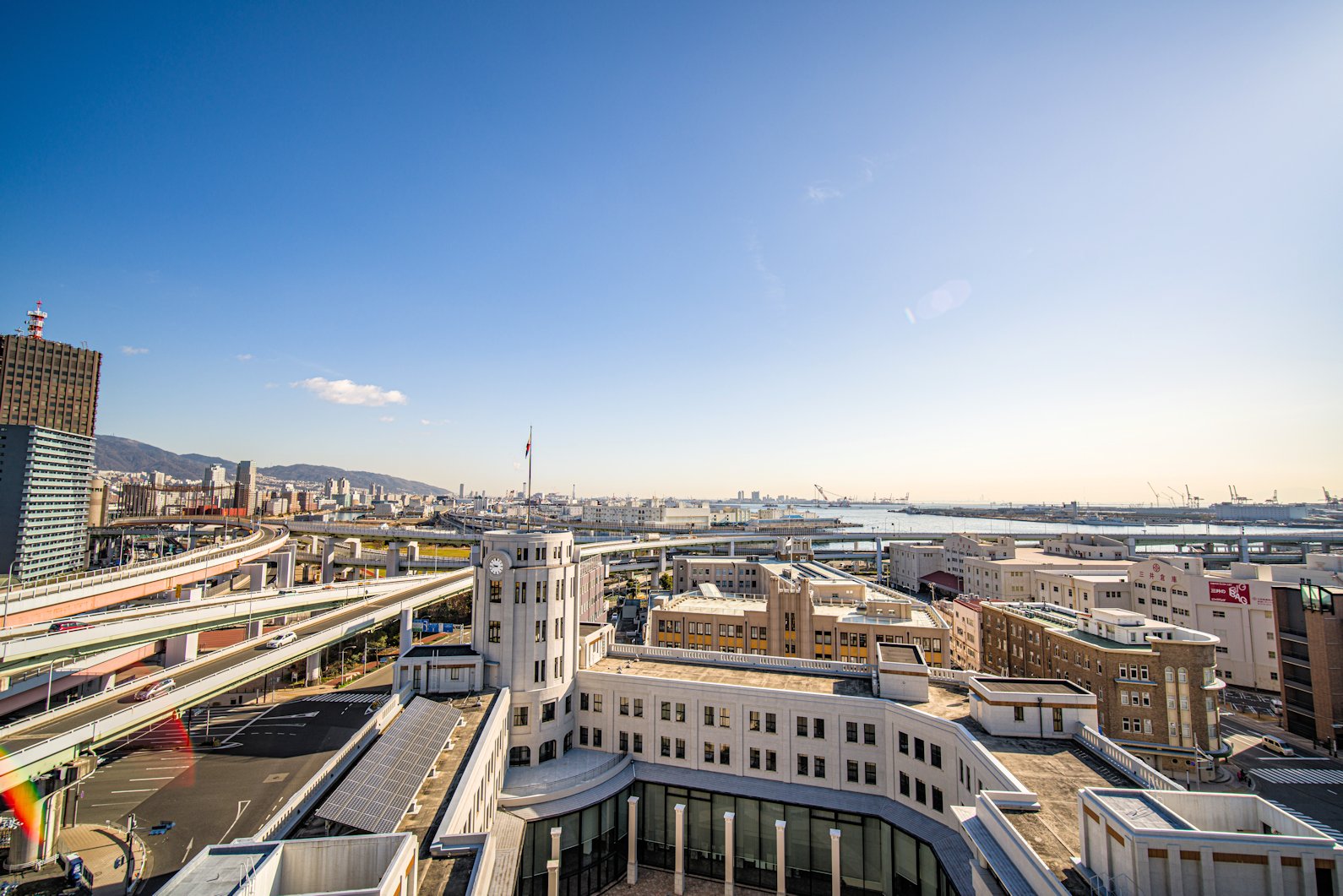 | 昭和2年(1927年)に竣工した2代目庁舎を保存・活用しながら船をイメージして建設された3代目現庁舎。 | 昭和2年から神戸港を見守る時計塔と税関旗。神戸税関屋上から撮影。 |