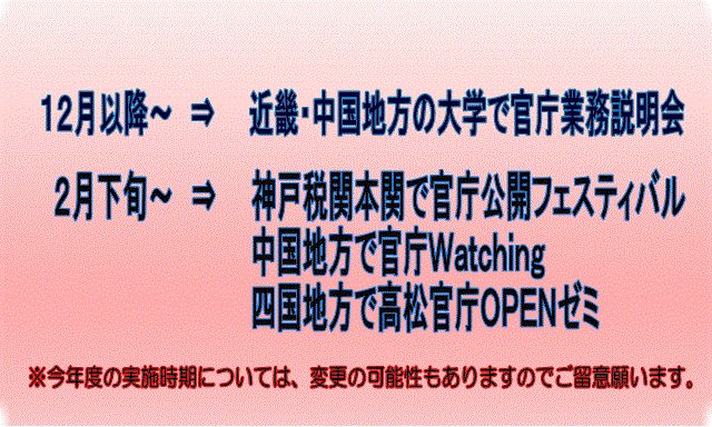 | 皆さん、こんにちは! 私たちは神戸税関総務部人事課の職員です。 神戸税関についてたくさんのことを知っていただきたいと思い、このたびホームページをリニューアルいたしました!皆さんが就職活動を進める上での参考になれば幸いです。 私たちは、1年を通して、人事院主催の説明会等に参加し、業務説明を行っています。一例を挙げますと、以下のとおりです。 |