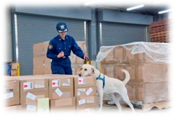 A.麻薬探知犬を扱う職員をハンドラーと言います。ハンドラーになるためには特別な 資格は必要ではありません。一般の税関職員がハンドラー養成のための数ヶ月間の訓練を受けることにより、ハンドラーになることができます。ハンドラーは、麻薬探知犬とともに麻薬・薬物の密輸取締りの最前線で大活躍しており、税関業務の中でも特にやりがいのある仕事の一つです。華々しい仕事の一方で麻薬探知犬の訓練や散歩、ブラッシングといった麻薬探知犬の世話もハンドラーにとっては大切な仕事です。 |
