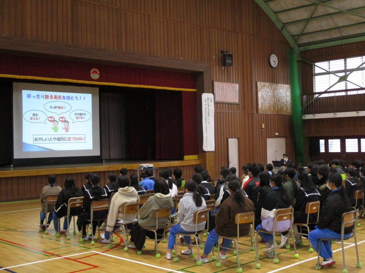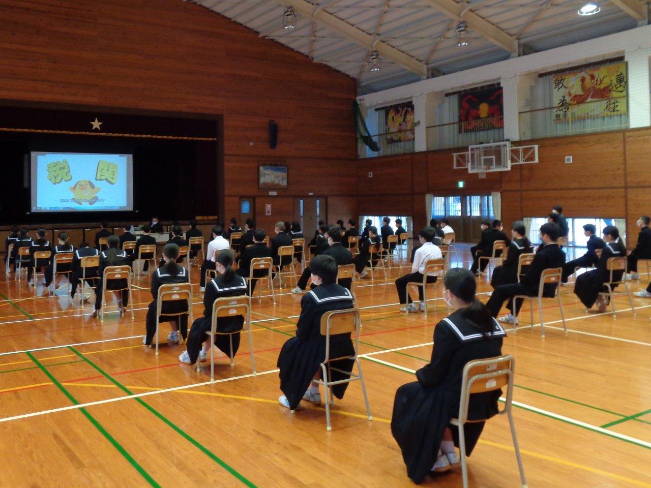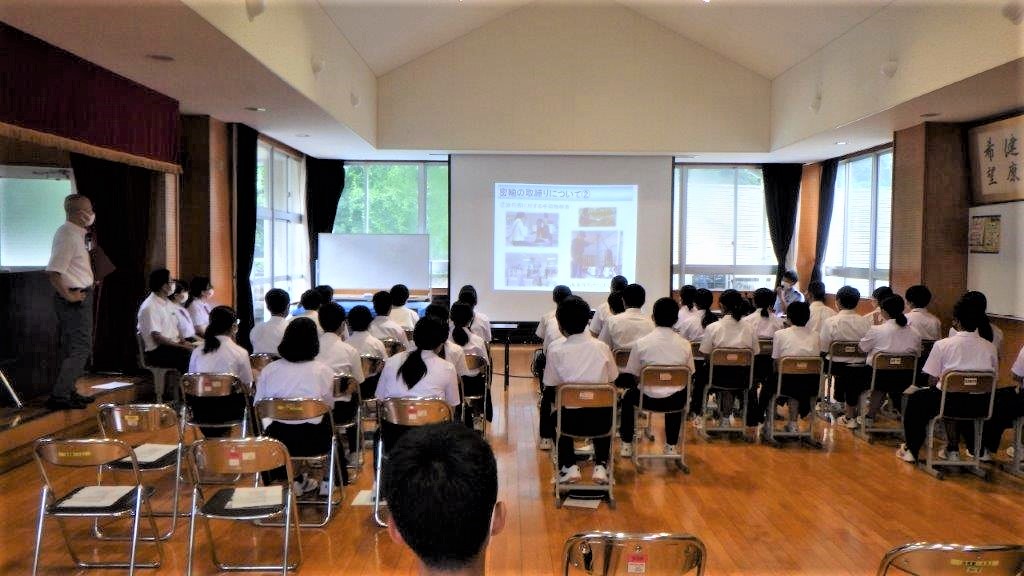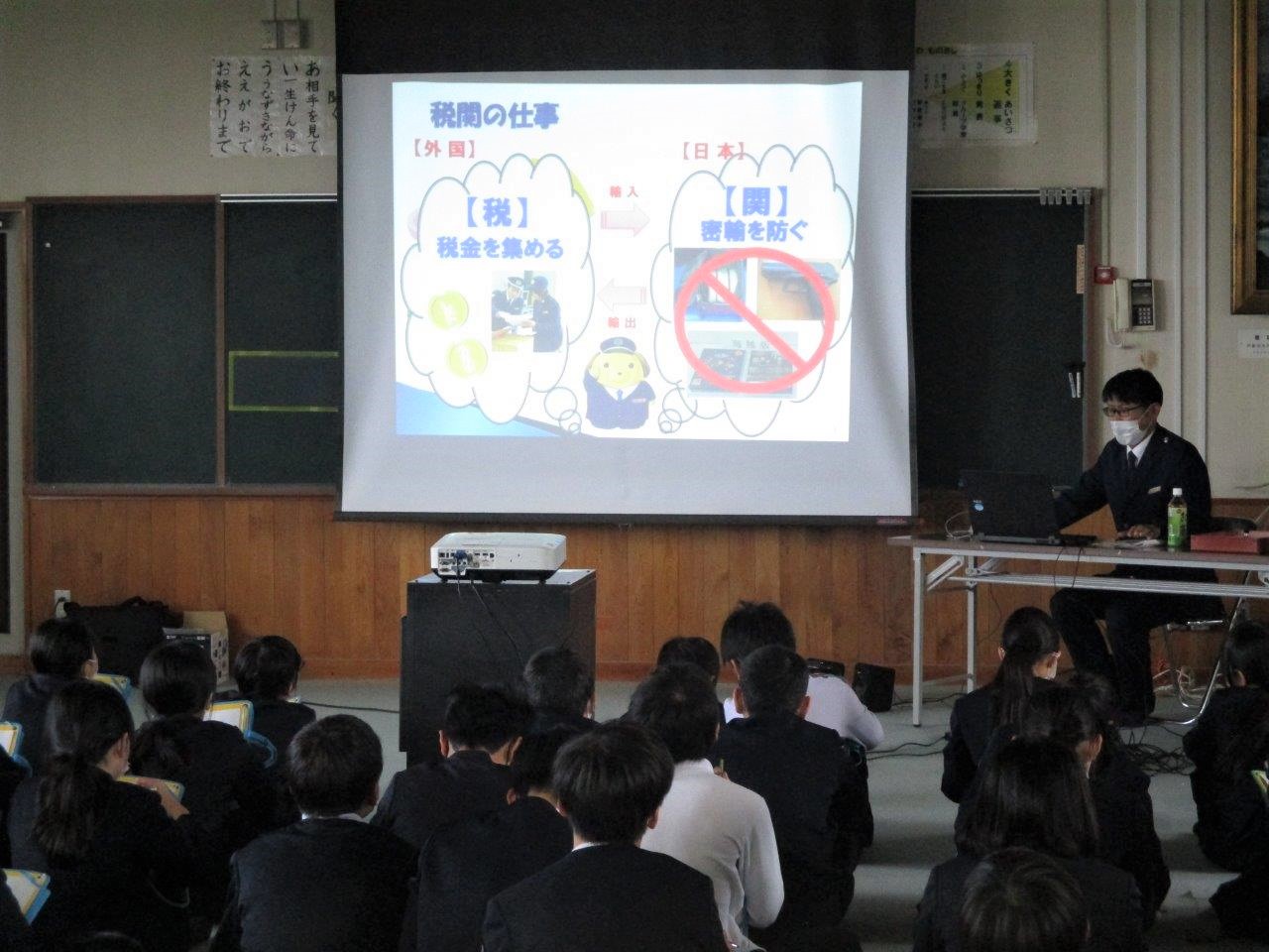 神戸税関松山税関支署は、愛媛県大洲市立大洲東中学校において全校生徒を対象に「税関の仕事」及び「不正薬物の恐ろしさ」について出前授業を実施しました。