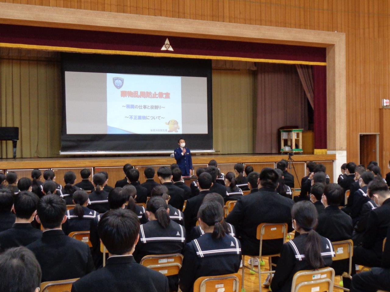 神戸税関新居浜税関支署は、新居浜市立東中学校において、「薬物乱用防止教室」と題し、全校生徒及び教職員計358名を対象に出前授業を実施しました。授業では、危険ドラッグを含む不正薬物の種類や薬物乱用による身体への影響について説明したほか、水際で不正薬物等の取締りを行う税関の仕事について紹介しました。