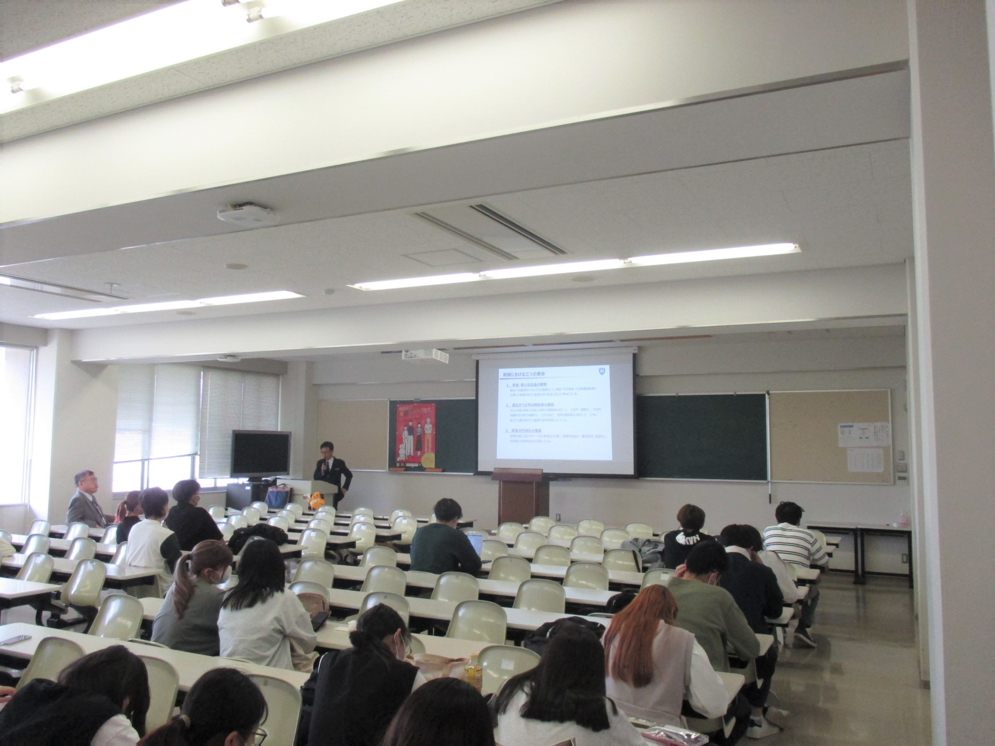神戸税関は、関税行政・税関業務への理解を深めてもらうことを目的とし、龍谷大学経済学部の3・4年生を対象とした「地方自治論」のカリキュラムにおいて、学生約60名に対し「税関の使命と役割」と題した講義を行いました。