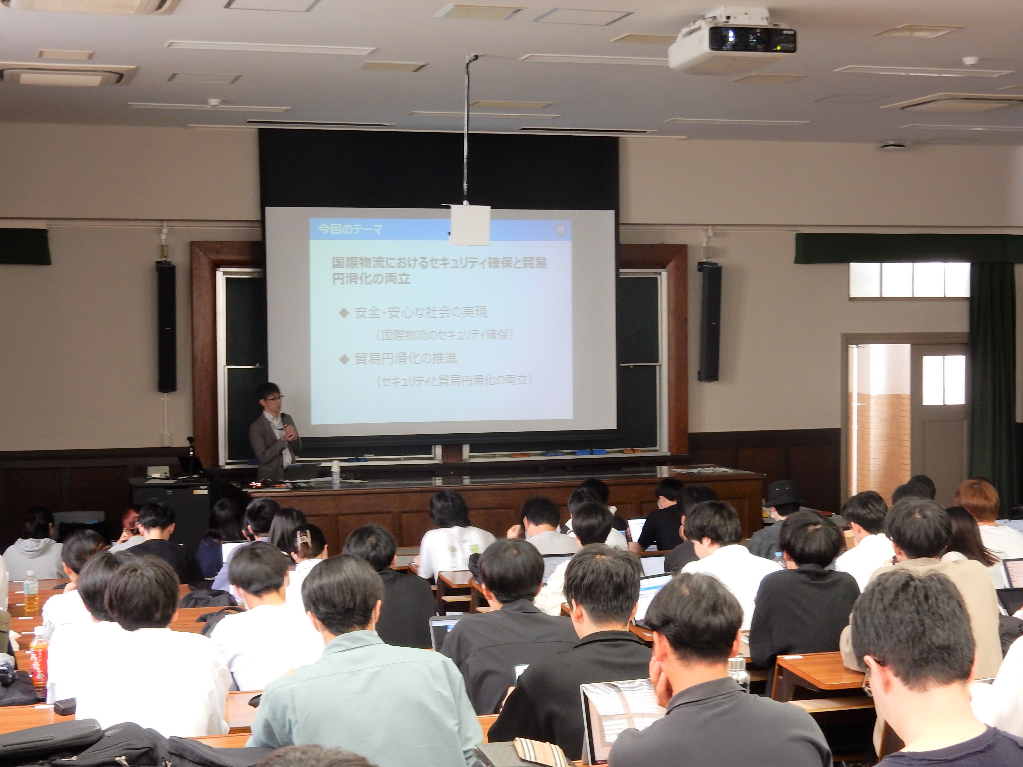 神戸税関は、関税行政・税関業務への理解を深めてもらうことを目的とし、神戸大学経済学部の3・4年生を対象とした「国際経済政策」のカリキュラムにおいて、学生約100名に対し2回にわたって講義を行いました。