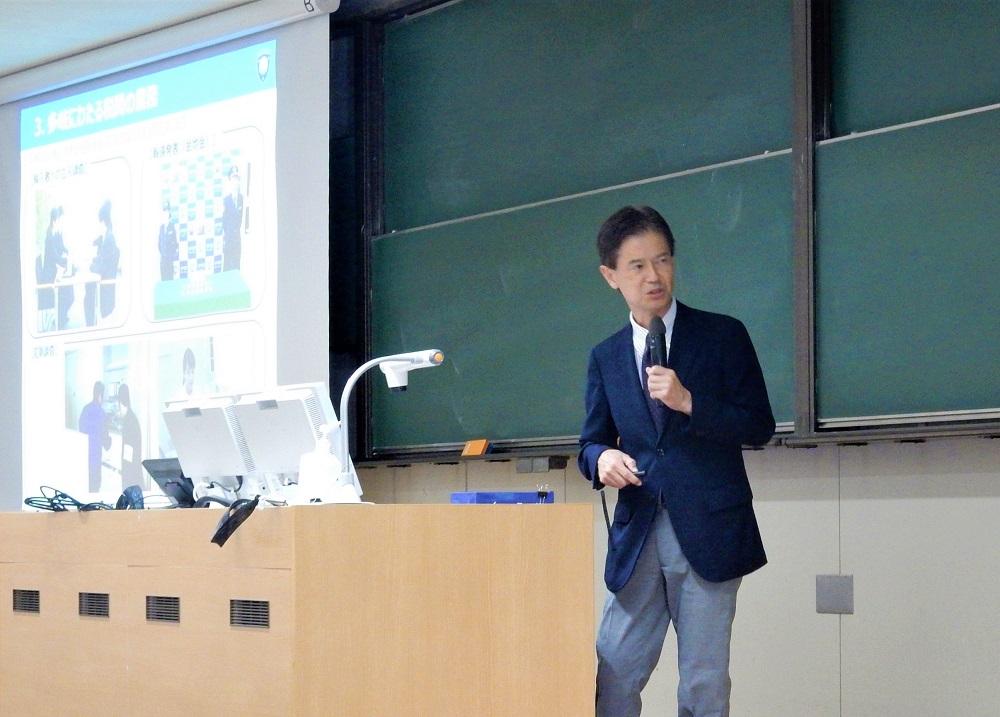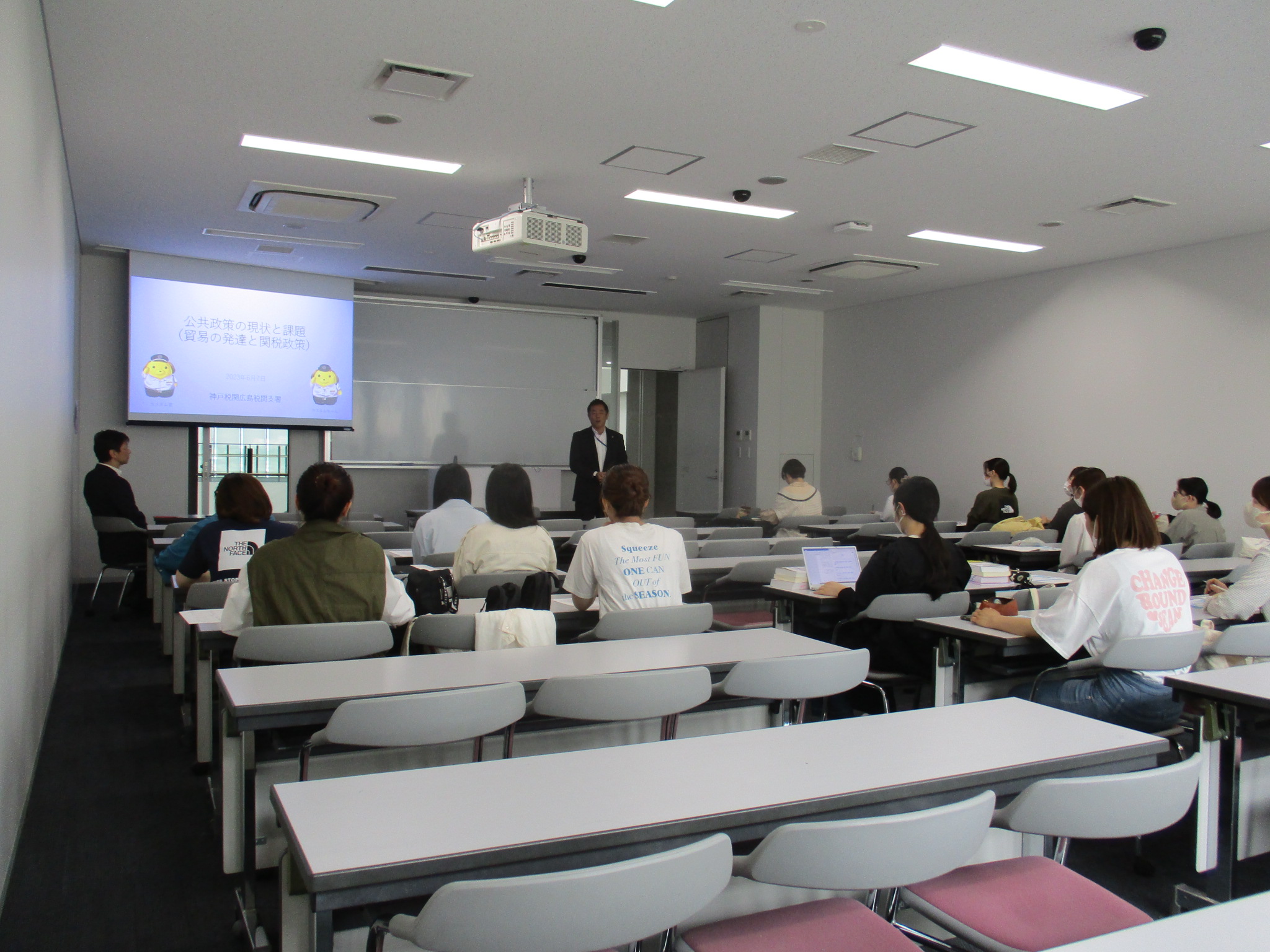 水島税関支署長ほかが講師となり、入学間もない学生を対象とした同講義において、我が国の貿易の推移、税関の3つの使命やスマート税関構想への取組みなどを中心に説明しました。