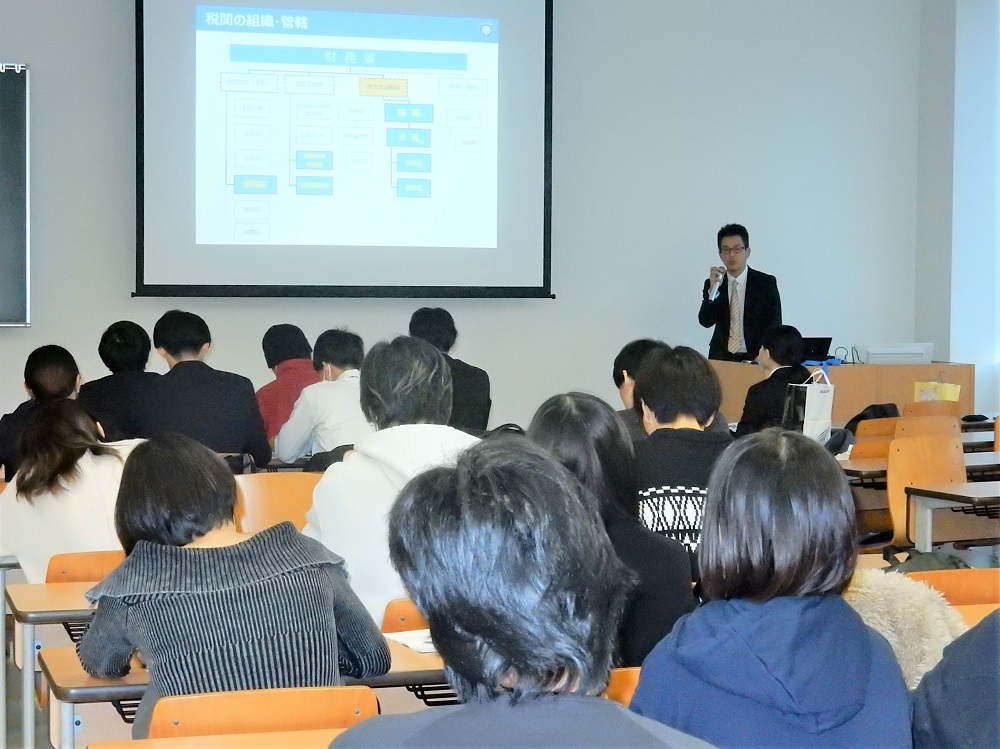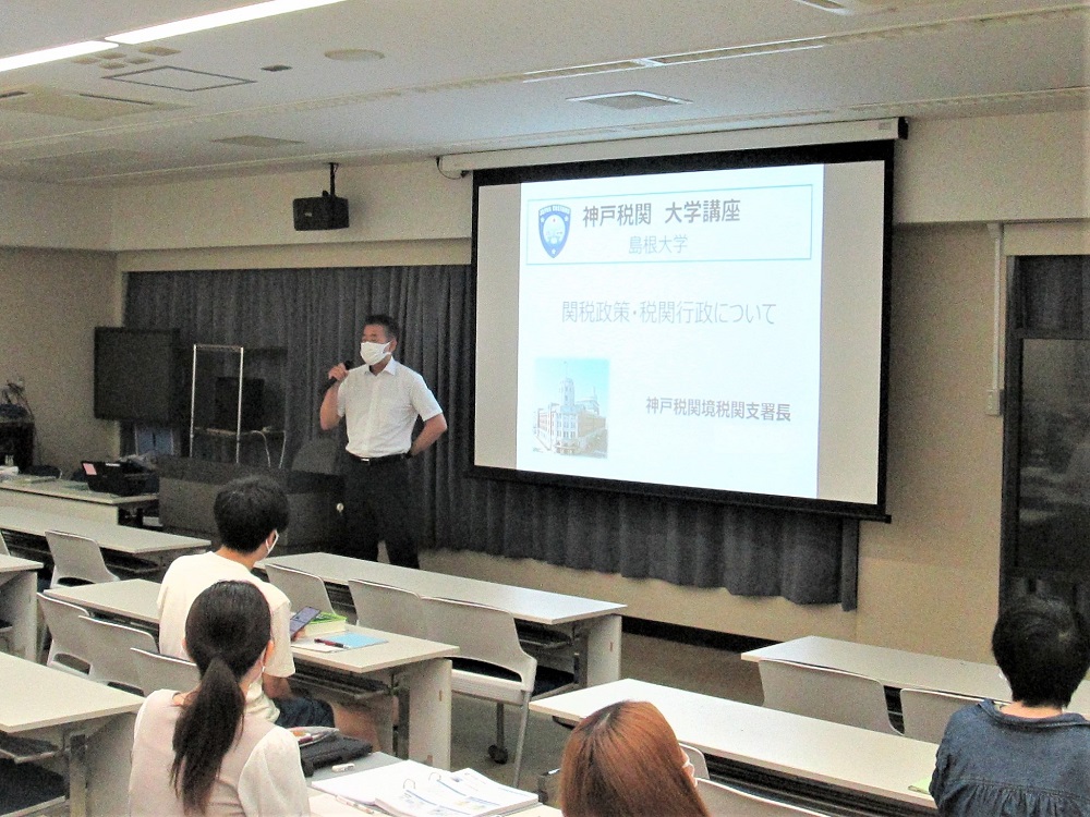 神戸税関は、関税行政・税関業務への理解を深めてもらうことを目的とし、島根大学法文学部「税財政法T」のカリキュラムにおいて、学生36名に対し「関税政策・税関行政について」と題した講義を行いました。