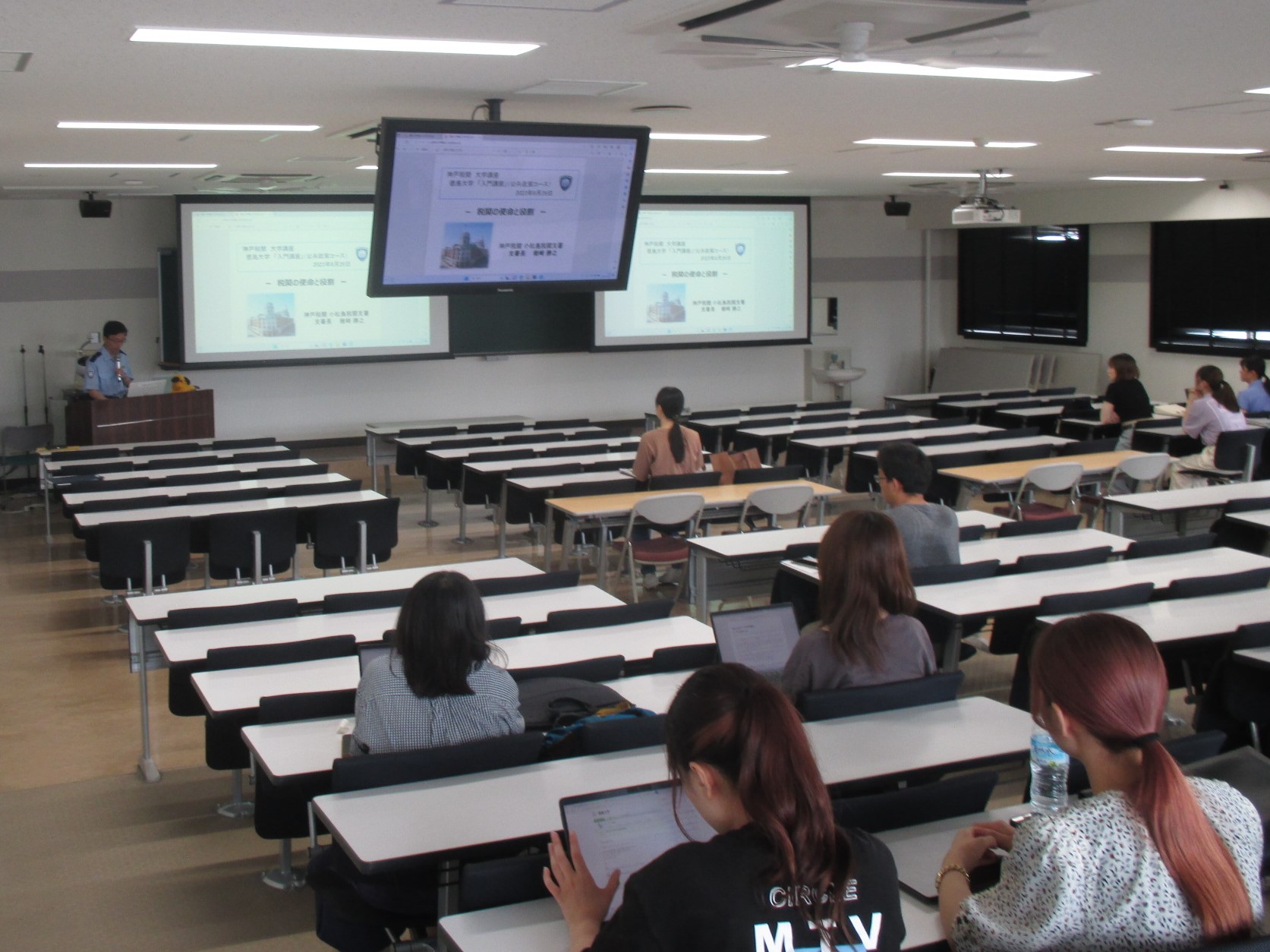 神戸税関は、関税行政・税関業務への理解を深めてもらうことを目的とし、岡山大学経済学部の1年生を対象とした「修学の方法」のカリキュラムにおいて、昼間部学生214名、夜間部学生43名に対し「税関の使命と役割について」と題した講義を行いました。