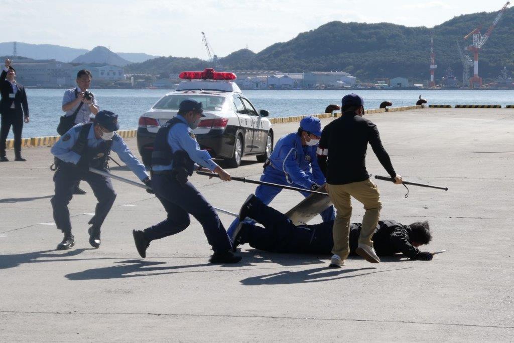 訓練は、岸壁警戒中の救急対応訓練、不審船の捕捉訓練、不審者の制圧訓練及び爆発物処理訓練の4つの類型について本番に即した内容で行いました。