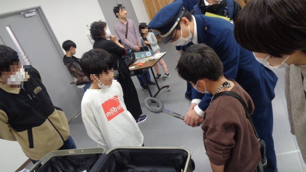 神戸税関松山税関支署今治出張所は、今治港湾合同庁舎にて、今治市港湾振興協会主催の海事関連施設見学会に参加しました。小中学生19名とその保護者等25名に対し、税関チャンネルの視聴、旅具検査体験(スーツケースの開披検査、携帯型金属探知機を使用した身辺検査)などを通じて、空港や港における税関の役割を理解していただくとともに、テロ関連物資、不正薬物及び金地金などの密輸防止、テロの未然防止に係る情報提供の協力を呼びかけました。