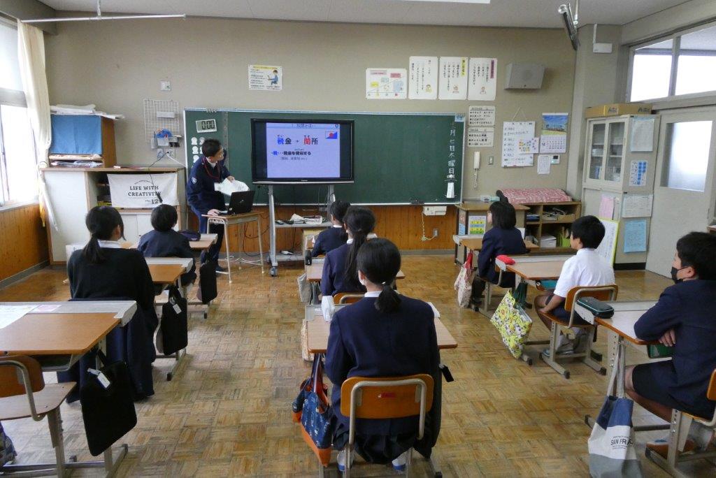 神戸税関水島税関支署は、岡山県倉敷市立連島中学校において、2年生の生徒を対象に「税関の仕事」と「不正薬物の恐ろしさ」をテーマとした出前授業を実施しました。