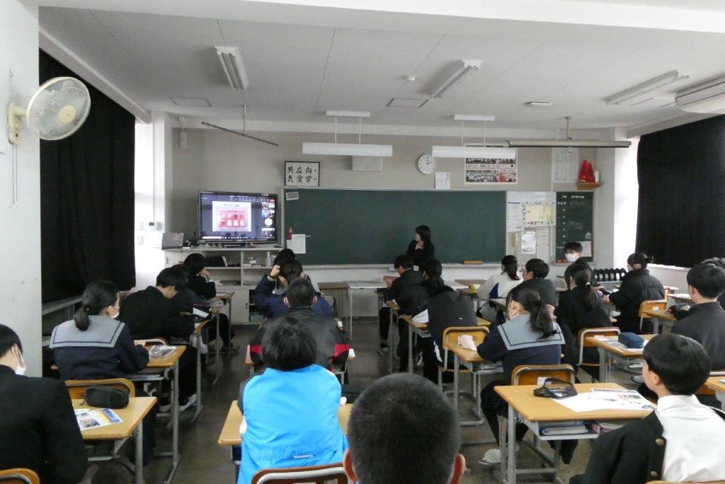 神戸税関水島税関支署宇野出張所は、瀬戸内市立長船中学校において3年生を対象に、税関についてのPRを含めた「税関の仕事」と「薬物の恐ろしさ」に関する出前授業を実施しました。