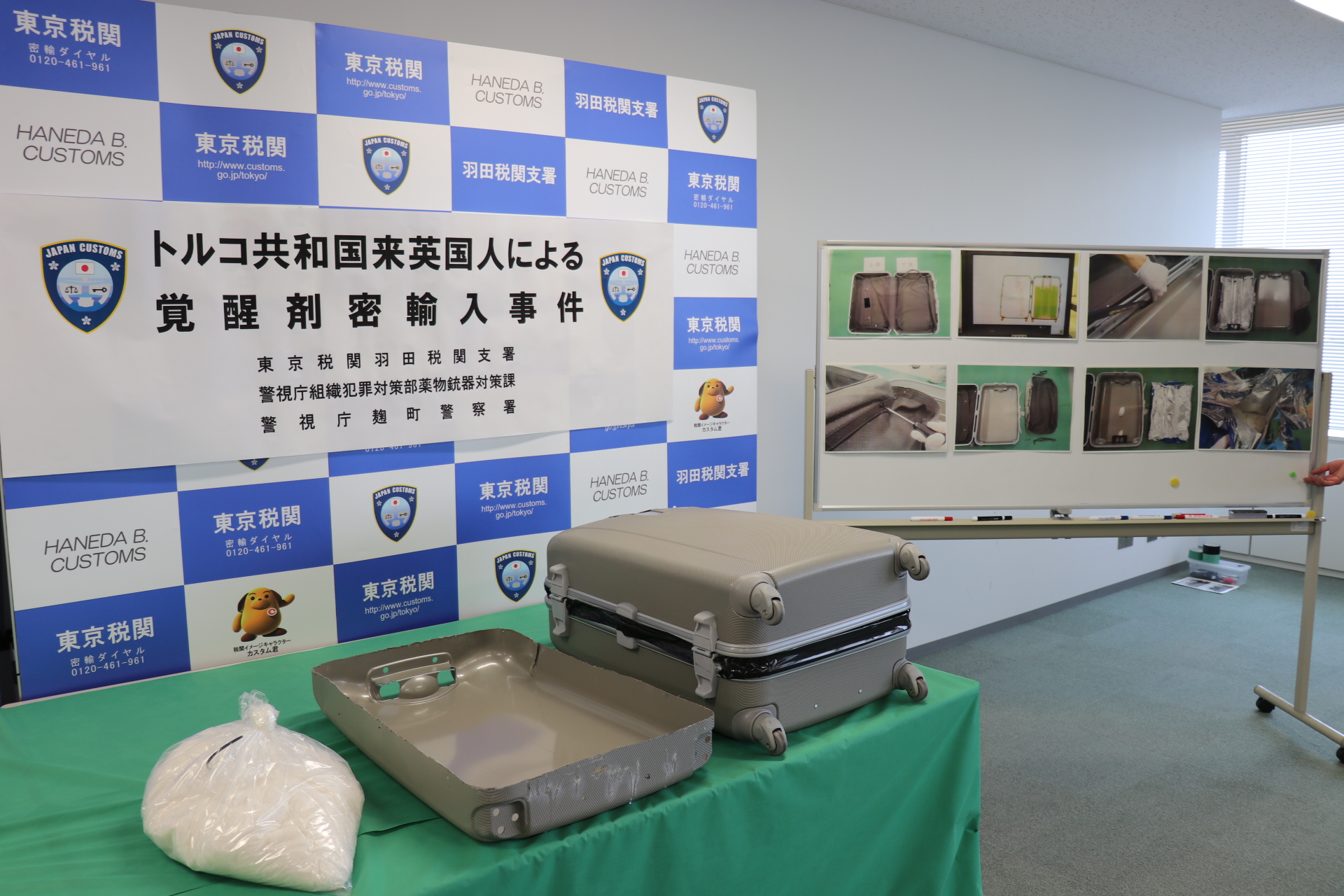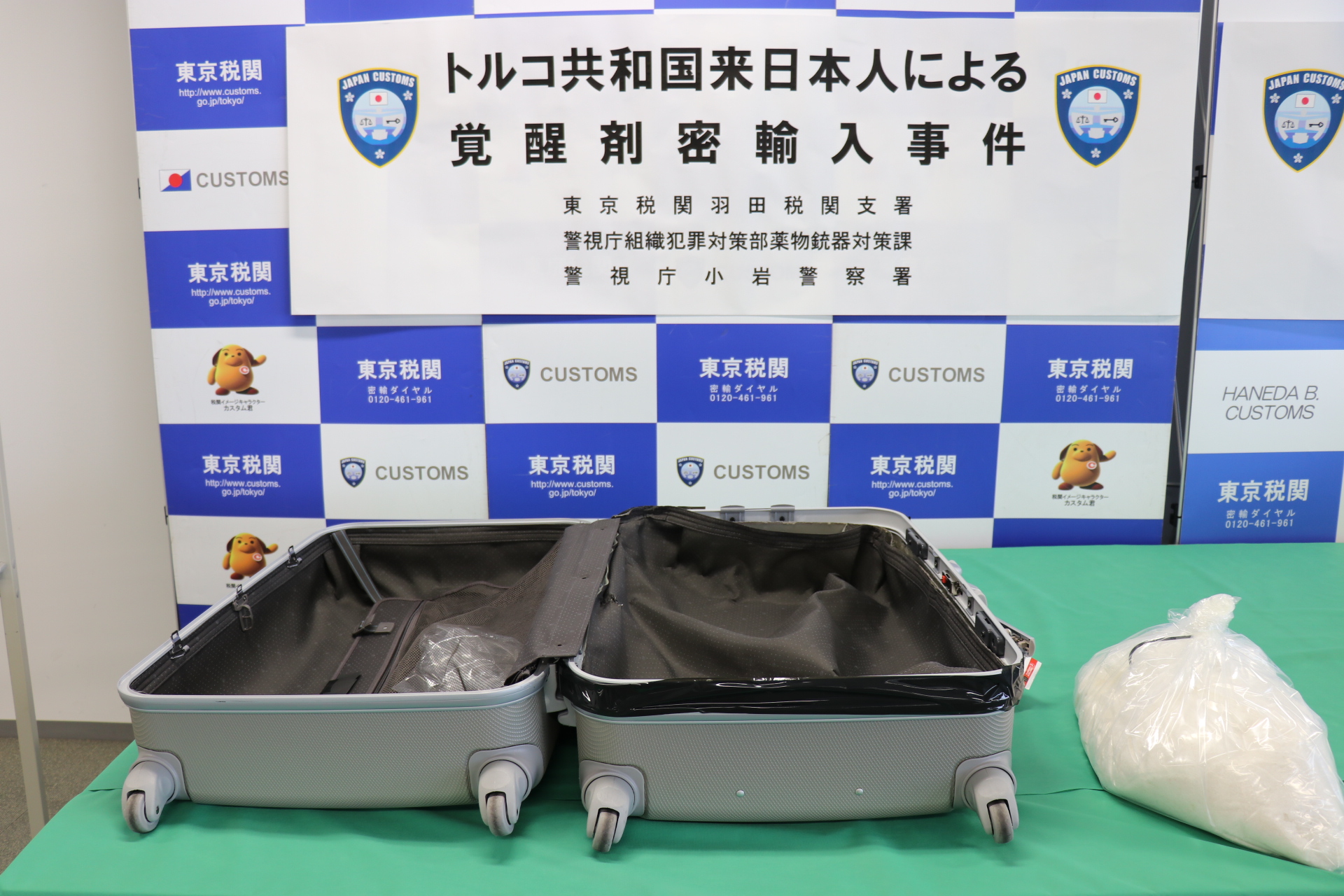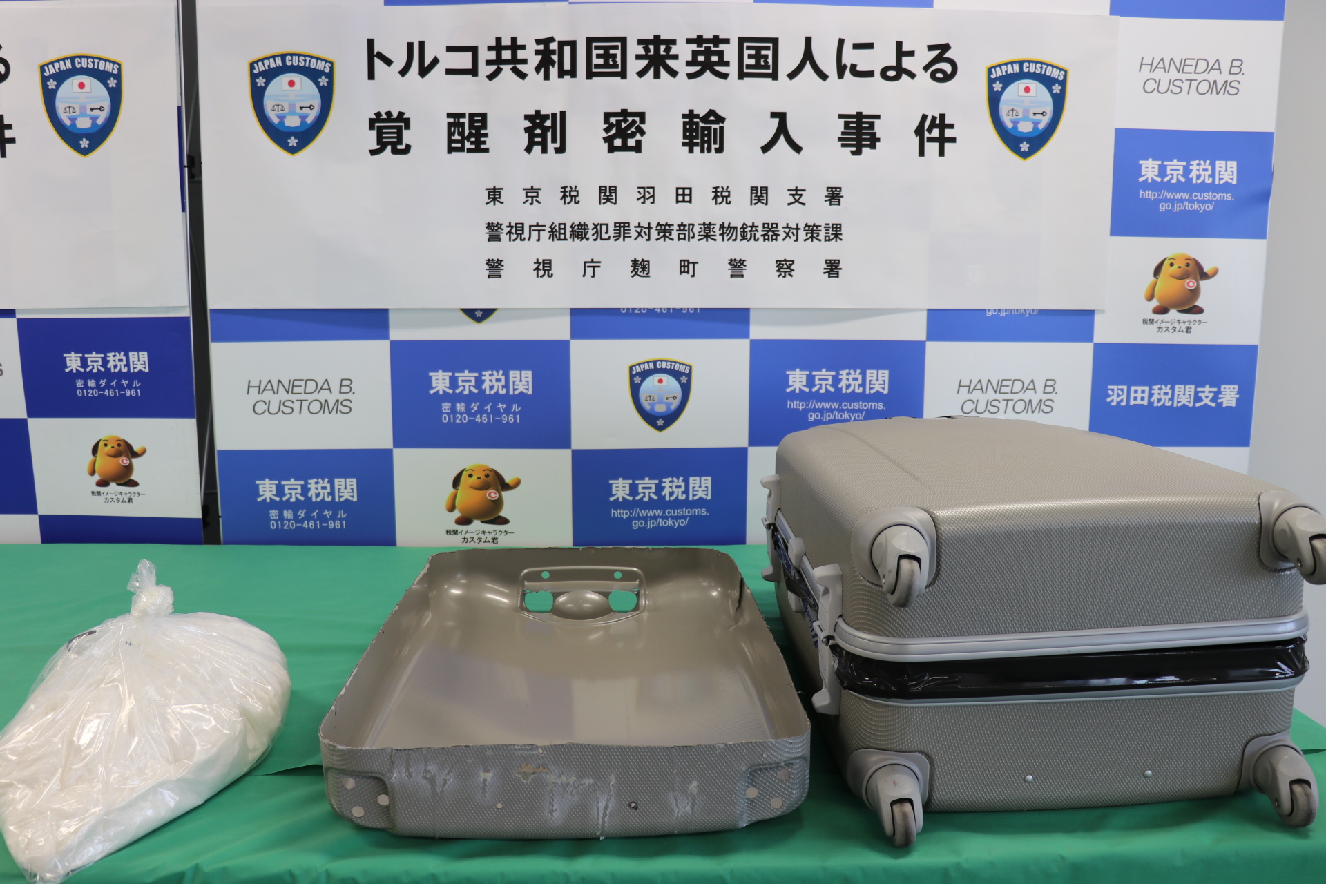 東京税関成田税関支署は、令和5年11月25日、アメリカ合衆国から成田国際空港に入国したアメリカ人男性2名が、大量の覚醒剤を密輸入しようとしたところを発見・摘発して、関税法違反、覚醒剤取締法違反で現行犯逮捕し、同月27日、千葉県成田国際空港警察署が身柄を千葉地方検察庁に送致しました。