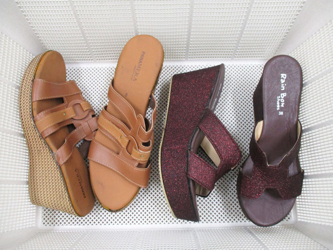 | @覚醒剤が隠ぺいされたサンダル2足 | A覚醒剤が入ったサンダル底内部の様子 |