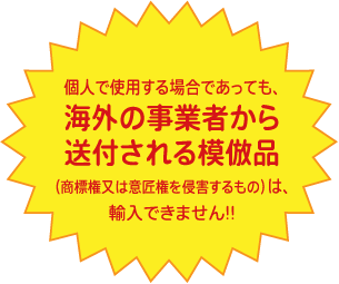 個人で使用する場合であっても、海外の通販サイトで購入した場合など、海外の事業者から送付される物品が商標権又は意匠権を侵害する模倣品である場合は輸入できません。税関による没収の対象となります。国内の通販サイトで購入した場合であっても、海外から直接送付されることもあるため、ご注意ください。