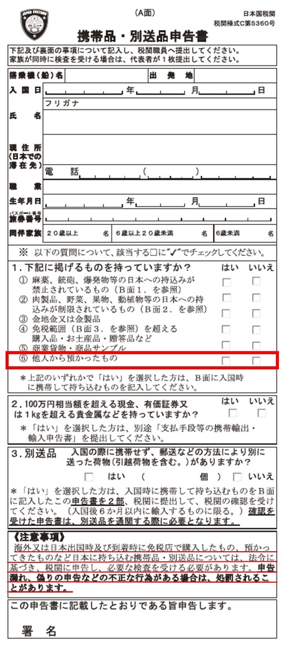| 「携帯品・別送品申告書」には、他人から預かったものの有無を確認する項目があります。 海外で何かを預かった場合には、必ず申告して下さい。 |
