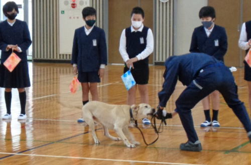 同教室では、水際で取り締まる税関の仕事や不正薬物の恐ろしさを説明するとともに、麻薬探知犬によるデモンストレーションを実施した。