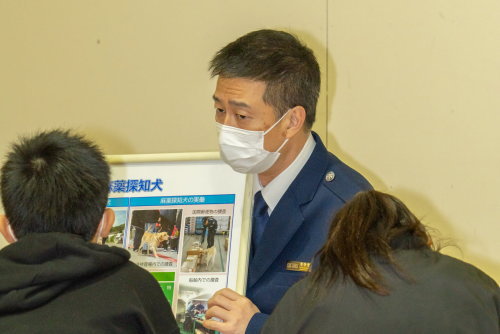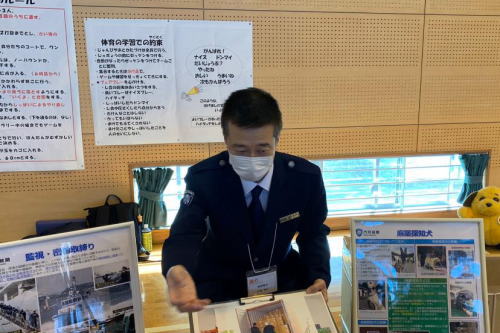 同教室では、税関の仕事や役割を紹介するとともに、隠匿模型の展示及び麻薬探知犬によるデモンストレーションを実施した。