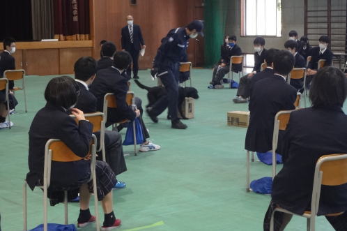 同教室では、税関の仕事や薬物の恐ろしさなどを説明した後、麻薬探知犬によるデモストレーションを実施した。