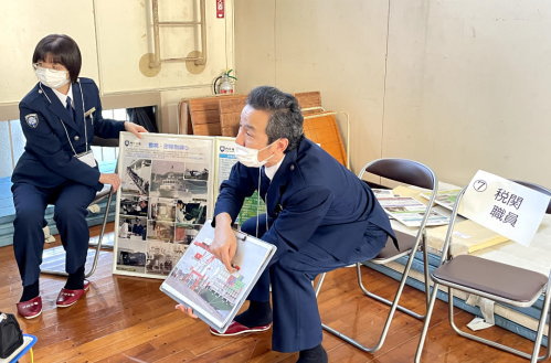税関業務の説明を行った後、コピー商品や模型を使った密輸手口の紹介し、旅具検査体験を行った。