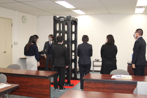 - 門司税関は、東洋信号通信社の職員9名の見学を受け入れ、税関業務について説明するとともに、不正薬物の隠匿事例やコピー商品の紹介、取締機器として税関で実際に使用している門型金属探知機や手持ち金属探知機の使用体験を行った。
