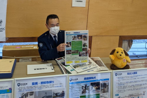 - 門司税関福岡空港税関支署は、福岡エアーカーゴターミナル株式会社保税蔵置場内税関検査場において、庫内作業従事者等(4社68名)を対象とした税関業務説明会の一環として麻薬探知犬デモンストレーションを行い、麻薬探知犬を活用した税関検査への理解と協力を求めた。