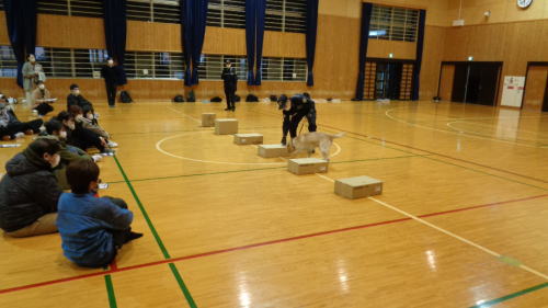 同税務署から税の仕組みや税の大切さなどを説明された後、当支署から税関の仕事や関税の目的について紹介し、麻薬探知犬によるデモンストレーションを実施した。