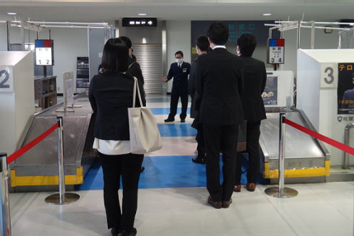 税関業務の概要のほか、出入国旅客の税関手続について経路をまわりながら説明を行った。