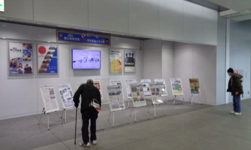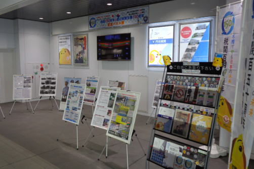 パネル展は、徳山駅構内の新幹線乗り場と在来線乗り場の間で行っており、税関の歴史や業務の紹介及び徳山支署の特色等のパネルを展示するとともに、税関150周年記念動画を放映している。
