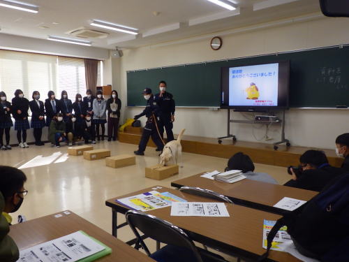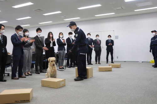当講座では、「薬物乱用の恐ろしさと税関の水際取締り」と題した講義とともに麻薬探知犬によるデモンストレーションを実施した。