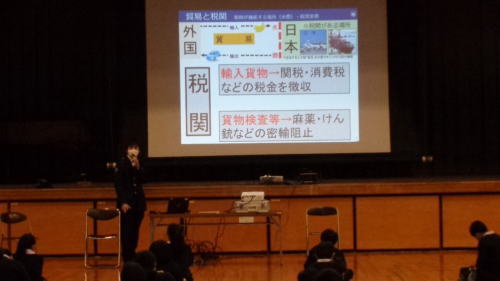 - 門司税関下関税関支署は、下関キャリア教育研究会主催の「夢授業」において、下関市立豊北中学校の生徒113名に対し、税関の役割を説明したほか、不正薬物等に係る取締りの経験を通して税関の意義や重要性を紹介した。