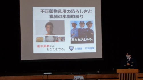 当教室では、不正薬物を水際で取り締まる税関の仕事や、薬物乱用の恐ろしさについて説明した。
