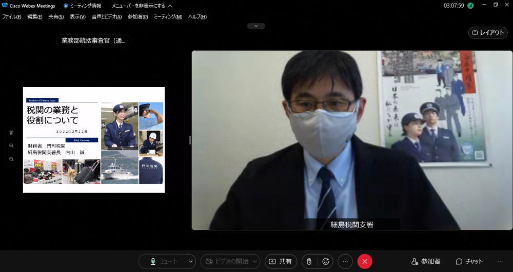 - 門司税関細島税関支署は、宮崎大学の学生約10名に対し、オンラインによる税関講座を実施し、細島税関支署長が税関の業務や役割についての説明を行った。