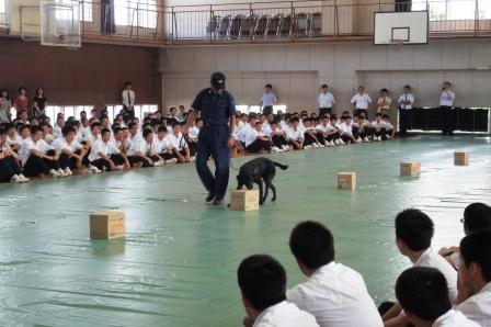 - 門司税関は、福岡県立小倉工業高等学校において、生徒等約700名を対象に税関教室を実施した。税関教室では、不正薬物の恐ろしさ等の説明、それを水際で取り締まる税関の役割についての紹介及び甘い言葉に騙され覚醒剤などの運び屋に決してならないよう注意喚起を行うとともに、麻薬探知犬によるデモンストレーションを行った。生徒等は麻薬探知犬に興味を示すとともに薬物等の恐ろしさや税関における不正薬物の取締りに理解を深めた。