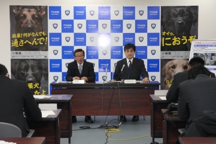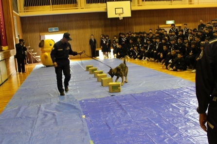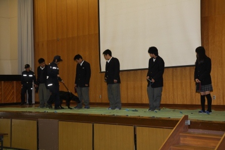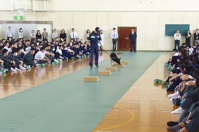 門司税関博多税関支署は、福岡県立香住丘高等学校において生徒約1,200名に対し、薬物乱用防止教育の一環として、不正薬物の恐ろしさ及びそれらを水際で取り締まる税関の役割について説明した。説明後には、麻薬探知犬のデモンストレーションを実施し、麻薬探知犬が、見事、麻薬の匂いを探り当てると、大きな拍手が起こった。