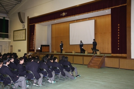 門司税関は、福岡県立苅田工業高校において、生徒等約520名を対象とした税関教室を開催し、その模様を報道機関に公開した。税関教室では、不正薬物の種類及び身体に及ぼす悪影響について説明するとともに、騙されて不正薬物の『運び屋』に仕立て上げられてしまった人の事例等を紹介し、最後に、麻薬探知犬のデモンストレーションを実施した。終了後、報道機関から生徒会長等に対するインタビューが行われ、生徒は緊張した面持ちながらも、「興味本位で不正薬物に手を出さないことはもちろん、海外旅行などで安易に他人の荷物を預かったりしないように、しっかりと注意しようと思いました。」等と回答していた。