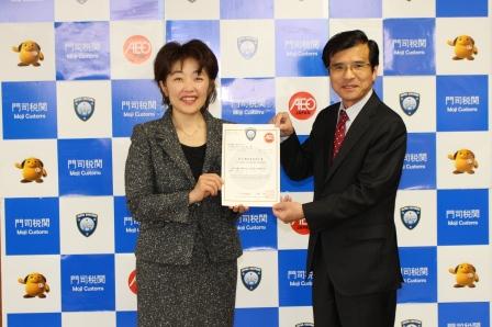 門司税関は、日新運輸工業株式会社を認定通関業者として認定し、今野税関長(写真左)から同社松浦代表取締役社長(写真右)に認定書を交付した。税関では国際物流におけるセキュリティ確保と円滑化の両立を図る観点から、平成26年にAEO制度を導入し、その利用拡大に取り組んでいるところである。