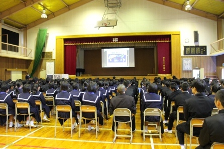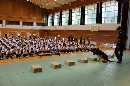 門司税関徳山税関支署は、光市立光井中学校(光市)において、報道機関に公開の下、全校生徒約220名を対象とした税関教室を開催した。初めに、原田同支署光出張所長から、税関の仕事内容、覚醒剤等の不正薬物が身体・精神に及ぼす悪影響及び税関における不正薬物の密輸摘発事例を説明した後、麻薬探知犬のデモンストレーションを実施した。生徒たちは、特に不正薬物の恐ろしさについての説明では、緊張した面持ちで聞き入り、また、隠された麻薬の匂いを見事に突き止めた麻薬探知犬の嗅覚の鋭さには驚きの声を上げていた。