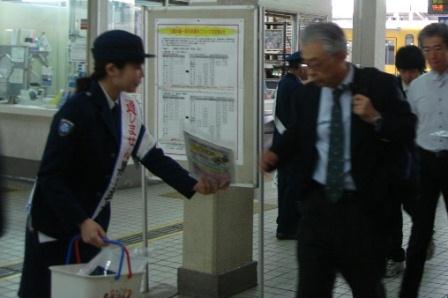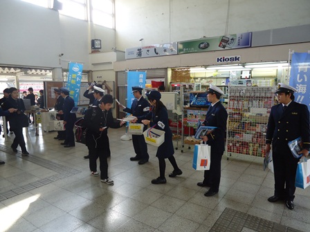 門司税関徳山税関支署平生出張所は、薬物及び銃器取締強化期間(5月7日〜31日)に伴い、JR柳井駅において、密輸情報提供等を呼びかける関係機関(警察、海上保安部)との合同キャンペーンを実施し、キャンペーンでは、制服職員が密輸情報提供等を呼びかけるチラシを配付した。